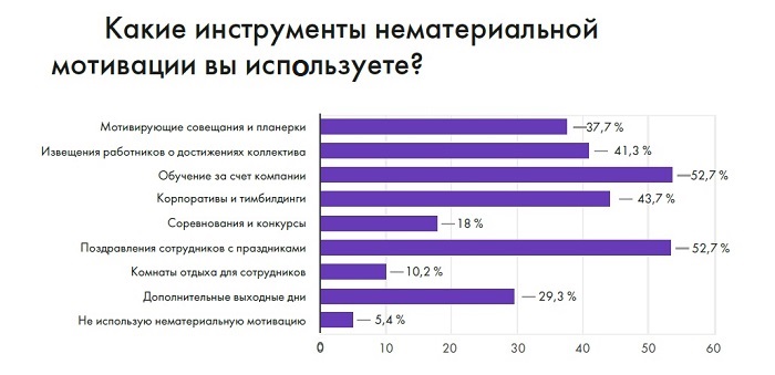 Отдельное внимание в рамках опроса было уделено мотивации сотрудников. Основная часть респондентов (75,1%) заявила, что в их компаниях существует система поощрения инициативных сотрудников. Кроме того, 88,4% опрошенных управленцев считают эффективным инструментом и нематериальную мотивацию. Чаще всего руководители мотивируют подчиненных с помощью обучения за счет компании (52,7%). Интересно, что многие управленцы предоставляют сотрудникам дополнительные выходные дни (29,3%).